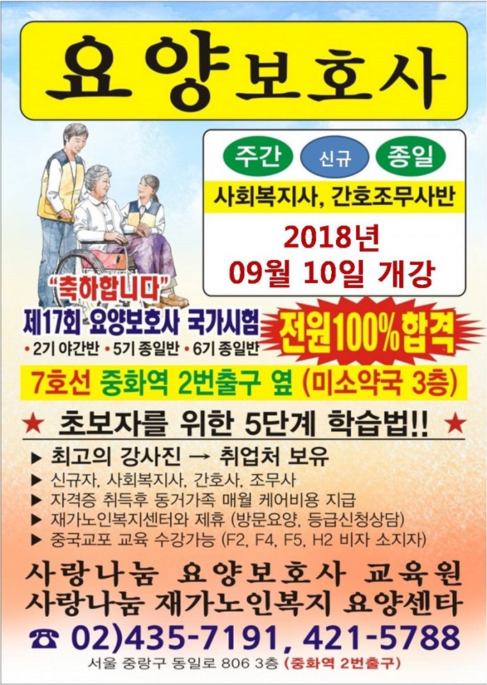 주소 : 서울특별시 중랑구 중화동 285-6 3층 사랑나눔요양보호사교육원ㅣTEL : 02-435-7191 / 02-421-5788ㅣFAX : 02-423-4325