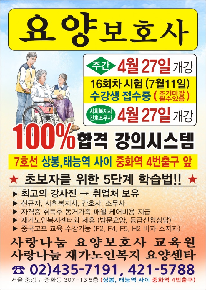 주소 : 서울특별시 중랑구 중화동 285-6 3층 사랑나눔요양보호사교육원ㅣTEL : 02-435-7191 / 02-421-5788ㅣFAX : 02-423-4325