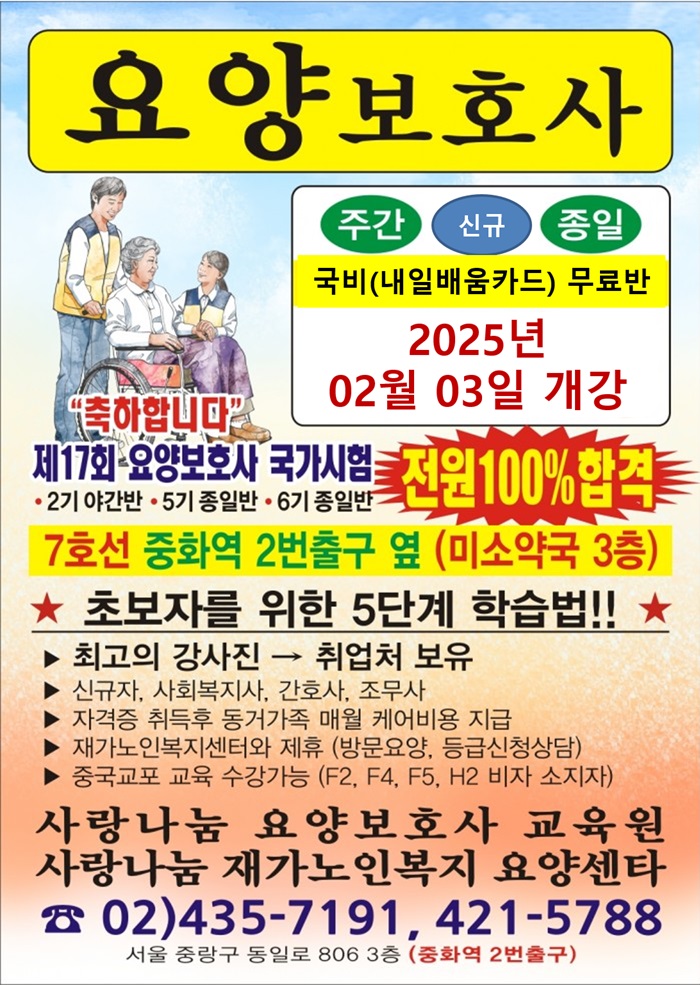 주소 : 서울특별시 중랑구 중화동 285-6 3층 사랑나눔요양보호사교육원ㅣTEL : 02-435-7191 / 02-421-5788ㅣFAX : 02-423-4325