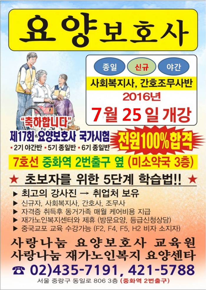 주소 : 서울특별시 중랑구 중화동 285-6 3층 사랑나눔요양보호사교육원ㅣTEL : 02-435-7191 / 02-421-5788ㅣFAX : 02-423-4325