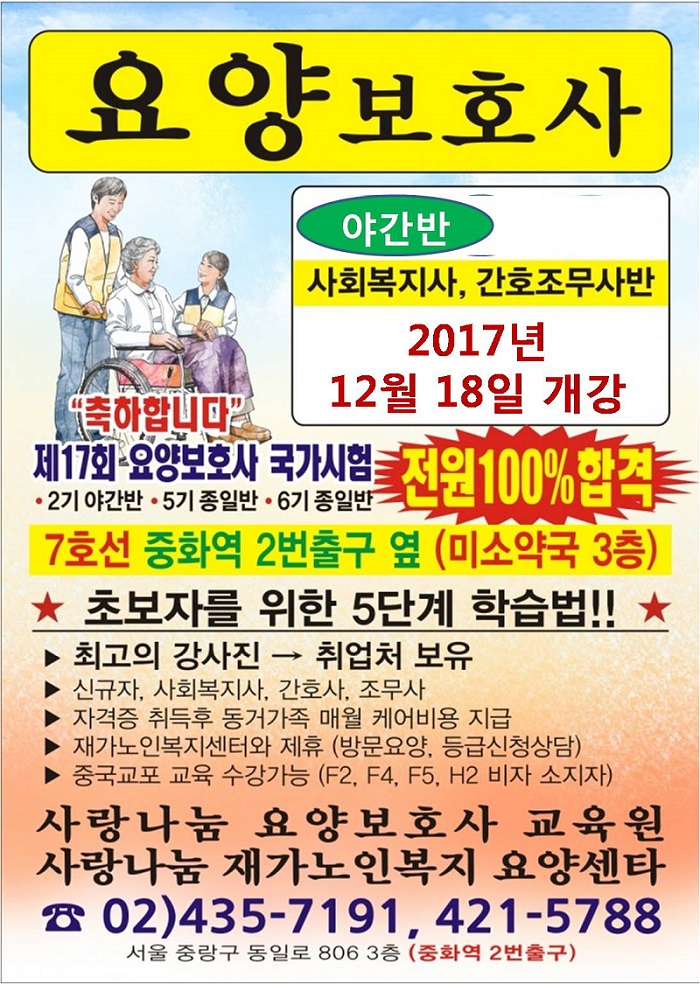 제24회 시험대비 2017년 12월 18일 야간반(신규/사회복지사/간호조무사)을 모집합니다.