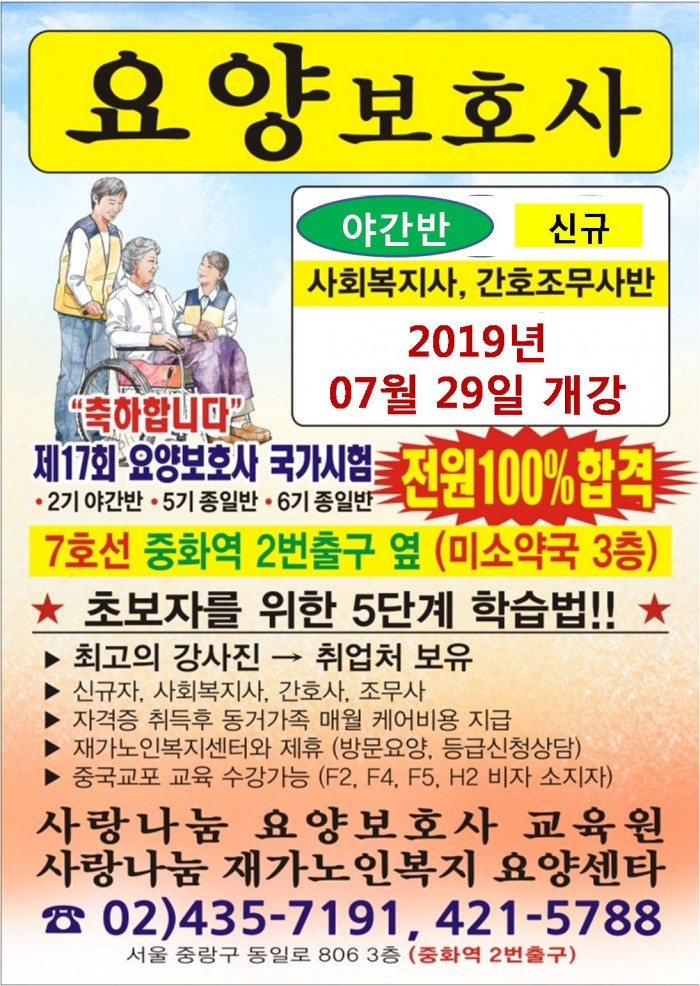 주소 : 서울특별시 중랑구 중화동 285-6 3층 사랑나눔요양보호사교육원ㅣTEL : 02-435-7191 / 02-421-5788ㅣFAX : 02-423-4325