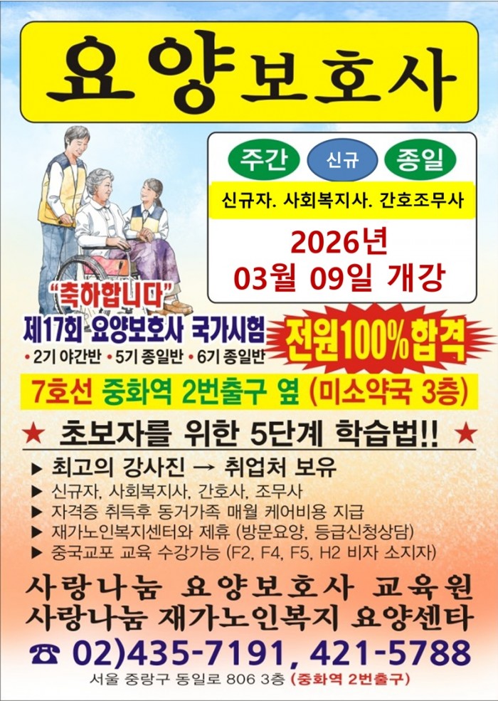 주소 : 서울특별시 중랑구 중화동 285-6 3층 사랑나눔요양보호사교육원ㅣTEL : 02-435-7191 / 02-421-5788ㅣFAX : 02-423-4325