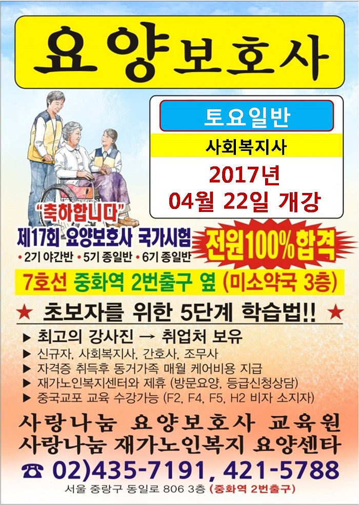 주소 : 서울특별시 중랑구 중화동 285-6 3층 사랑나눔요양보호사교육원ㅣTEL : 02-435-7191 / 02-421-5788ㅣFAX : 02-423-4325