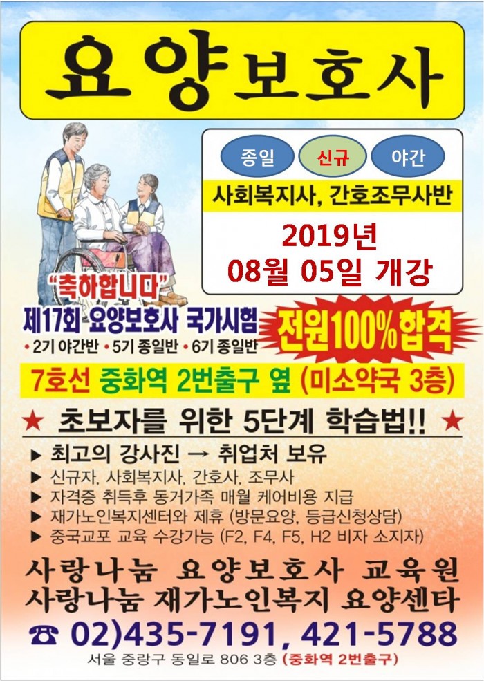 주소 : 서울특별시 중랑구 중화동 285-6 3층 사랑나눔요양보호사교육원ㅣTEL : 02-435-7191 / 02-421-5788ㅣFAX : 02-423-4325